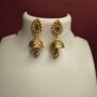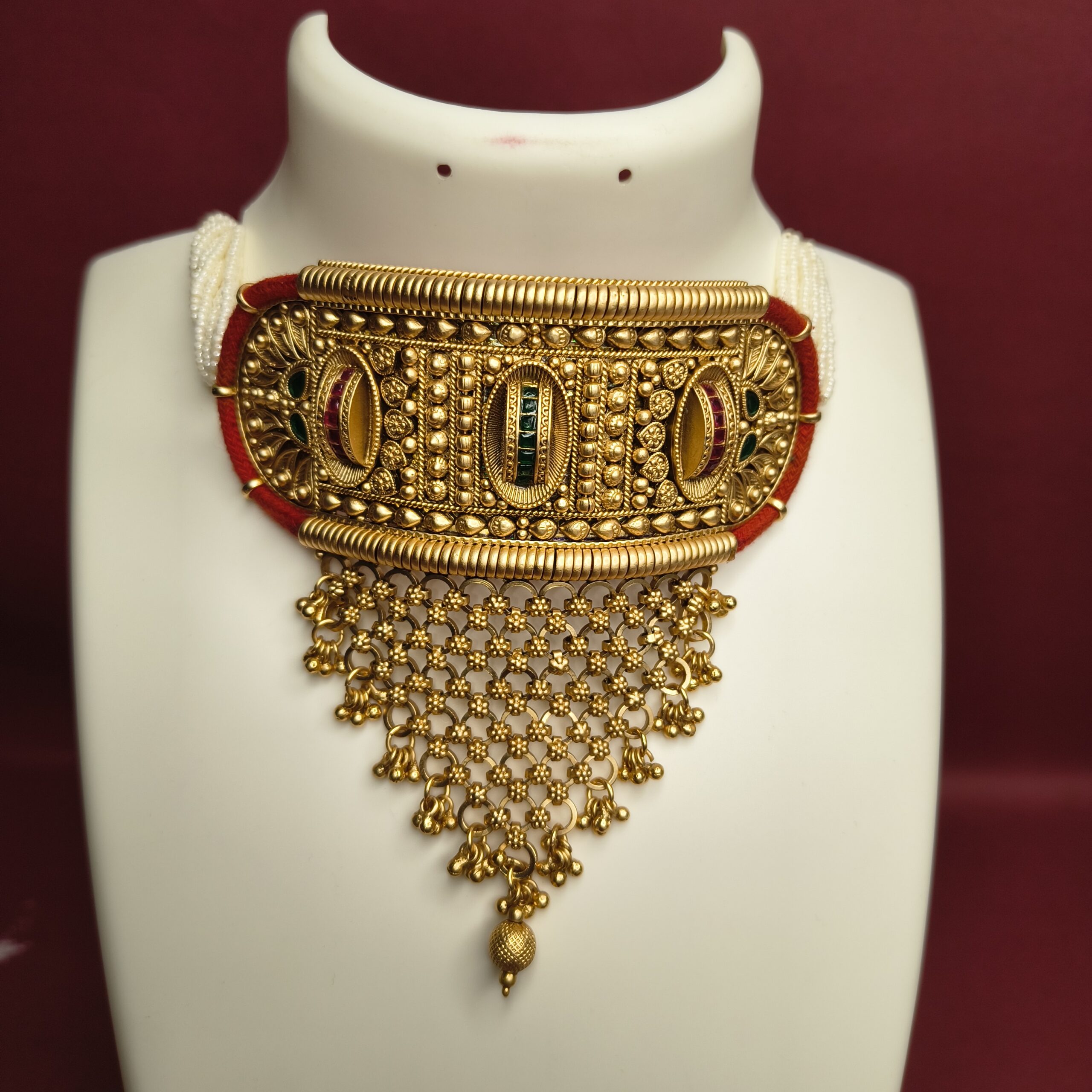 Necklace Design: A broad, curved pendant design with embossed motifs and bead work, enhanced with colored stone accents in red and green. The lower edge is adorned with delicate mesh-like danglers for added richness.