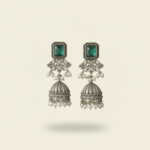 Elegant silver replica jhumka earrings featuring a deep green stone top with intricate detailing and pearl drops, ideal for festive and traditional styling.