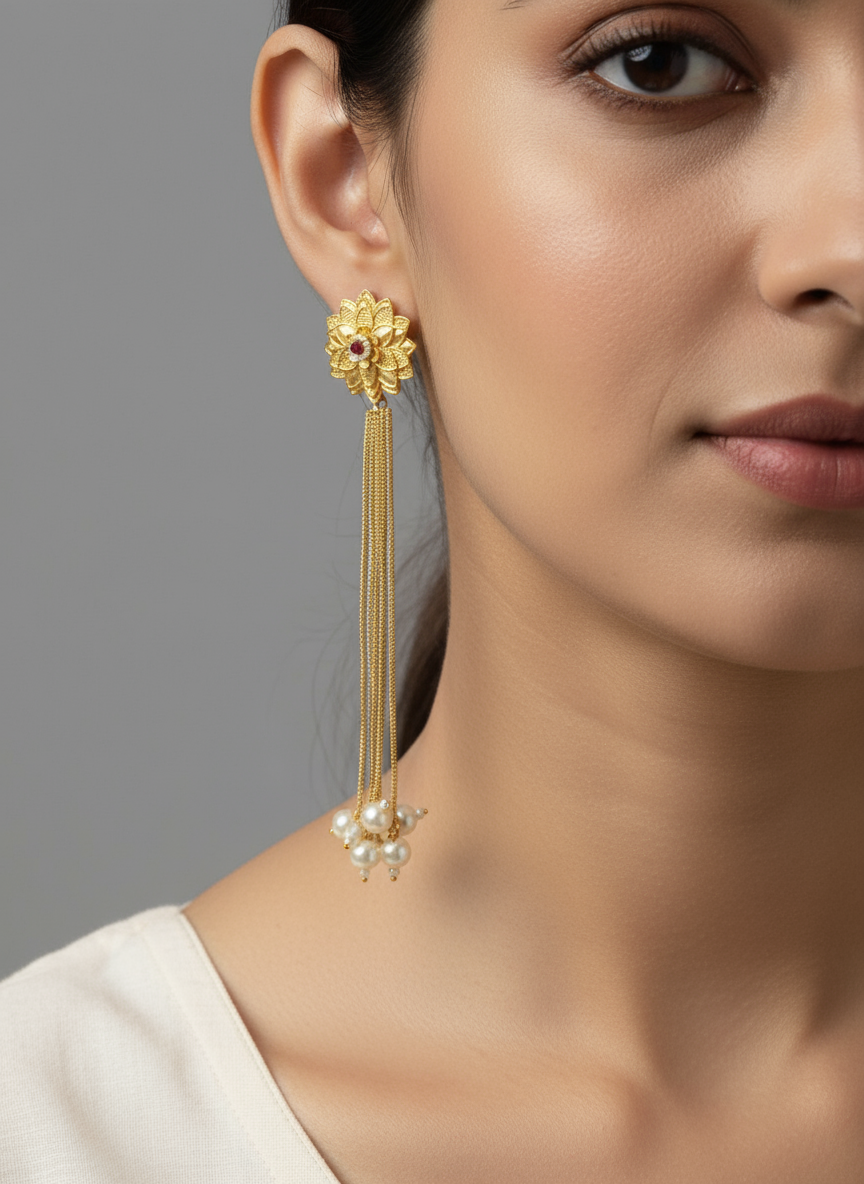 Layered floral motif with long multi-chain tassels and pearl cluster drops