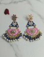 Elegant Meenakari chandbali earrings featuring a royal blue and pink enamel design with kundan-style stones and pearl drops. Perfect for weddings, festive occasions, and traditional ethnic wear.
