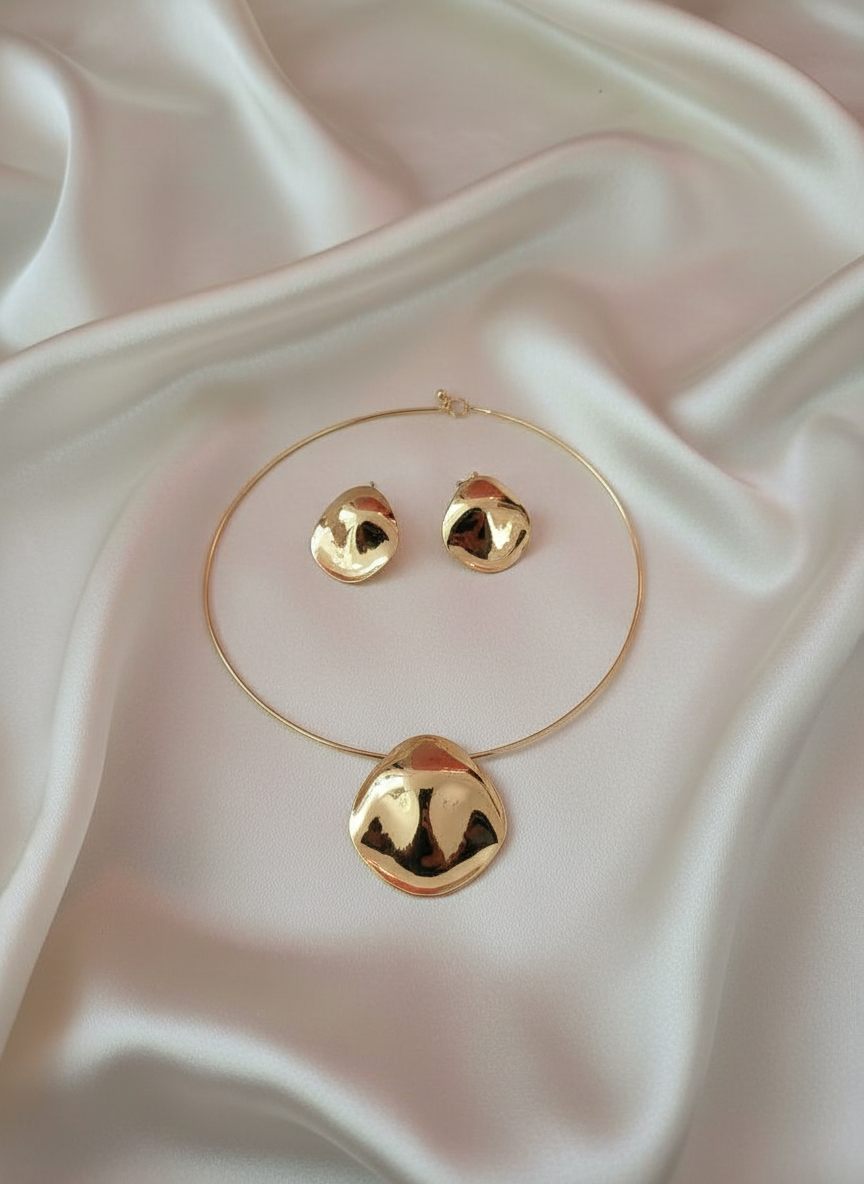 A sleek and minimal stainless steel hasli set featuring a smooth gold-finish pendant with matching stud earrings. Designed for effortless everyday elegance and modern festive styling.