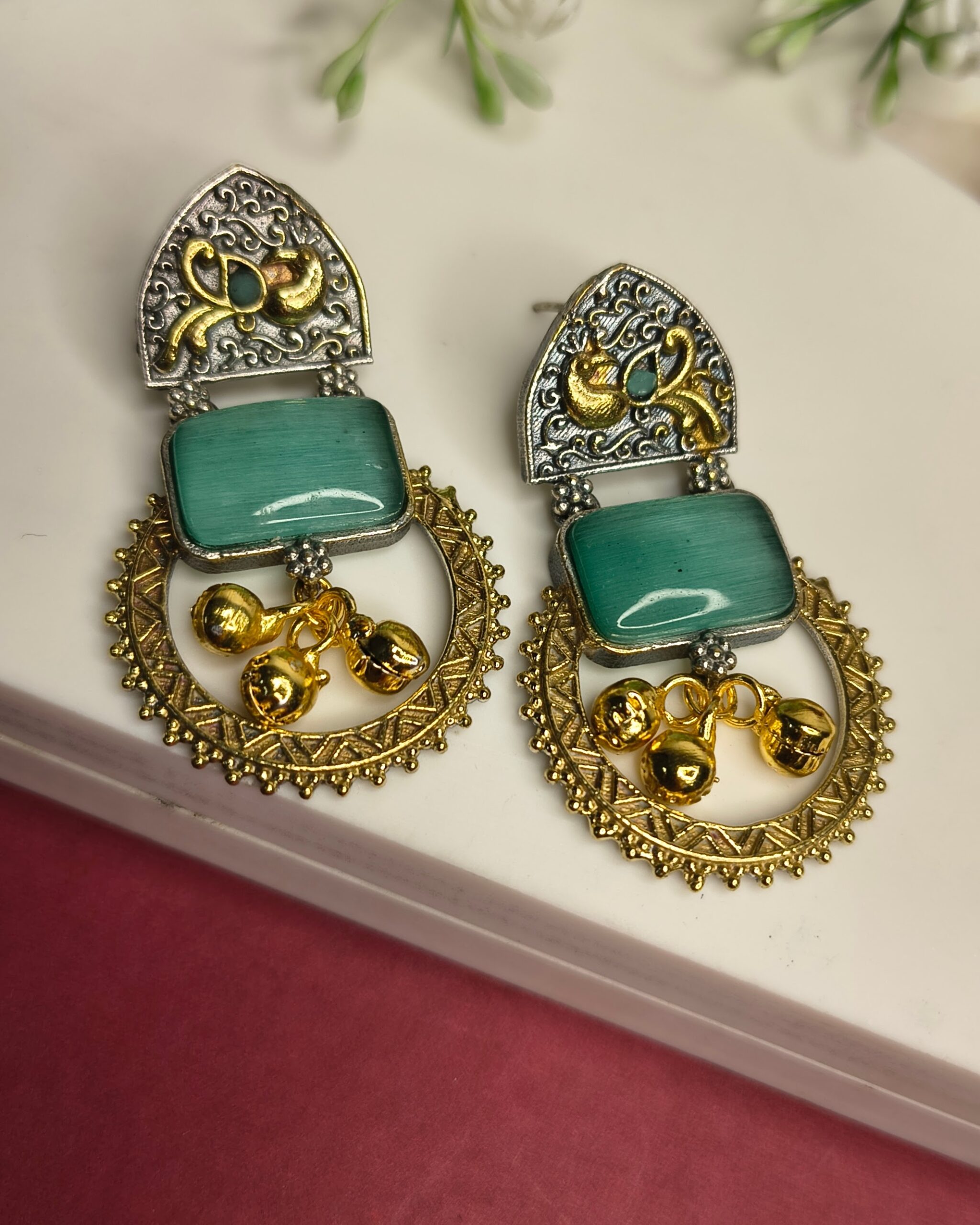 Dual-tone statement earrings with antique peacock motifs, green stone detailing, and golden ghungroo danglers – a perfect blend of tradition and elegance.
