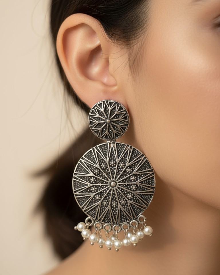 Elegant silver replica earrings featuring a detailed circular pattern with soft pearl drops, perfect for adding a classy ethnic touch to any outfit.